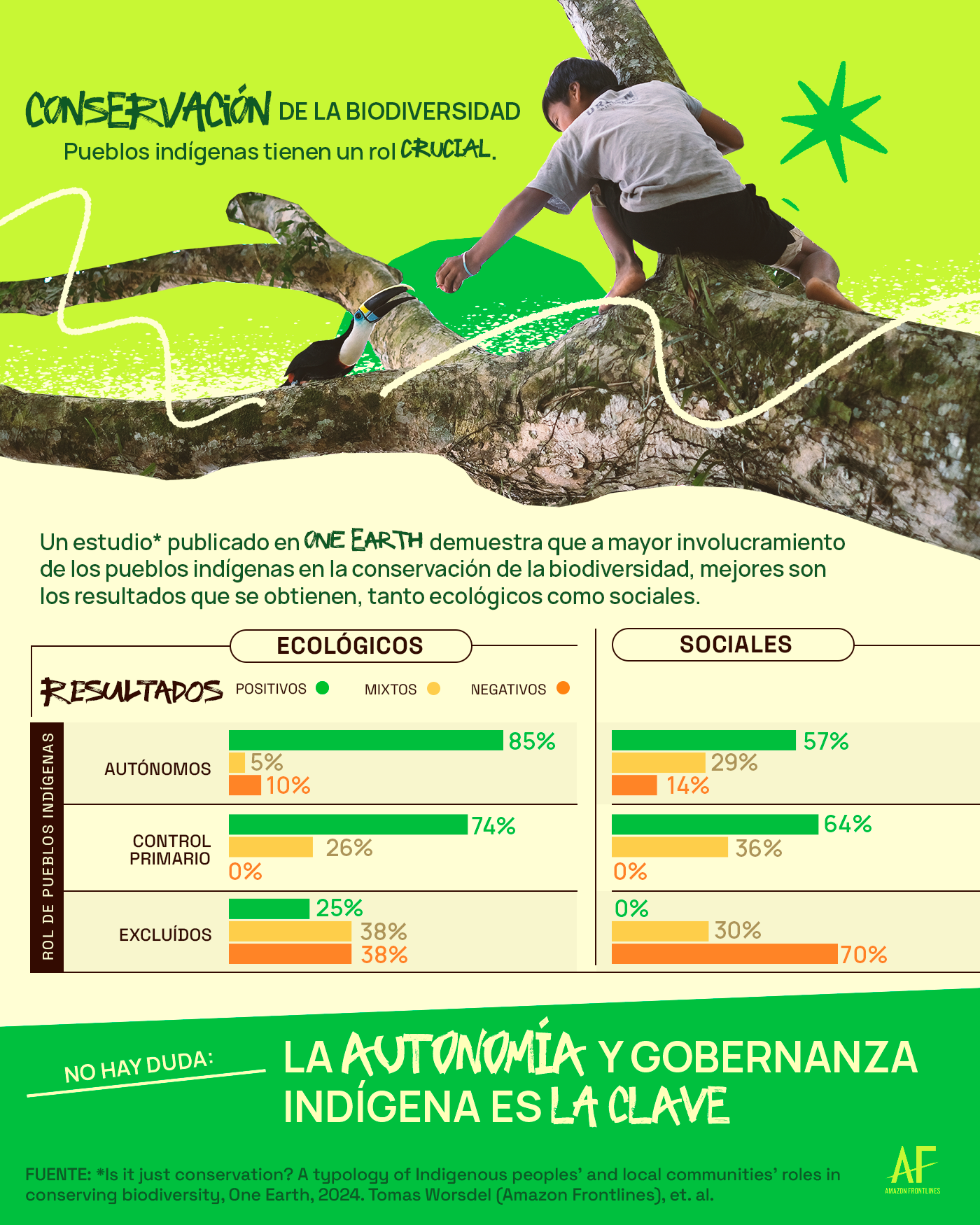 En contraste, cuando los Pueblos Indígenas tienen mayor control y libertad para vivir de acuerdo con sus valores culturales (cosmogonía), el éxito ecológico va de la mano con mejores  resultados sociales. Las comunidades pueden vivir libremente y defender sus territorios de acuerdo con sus valores espirituales y culturales para vivir en armonía, fortalecer sus instituciones, compartir equitativamente los beneficios mejorando su calidad de vida, tanto individual como colectivamente. Estos hallazgos hacen eco a investigaciones previas, demostrando cómo los resultados positivos tanto para el bienestar colectivo tanto como para la conservación provienen de casos en los que los Pueblos Indígenas desempeñan un papel central en la toma de decisiones sobre la conservación.
