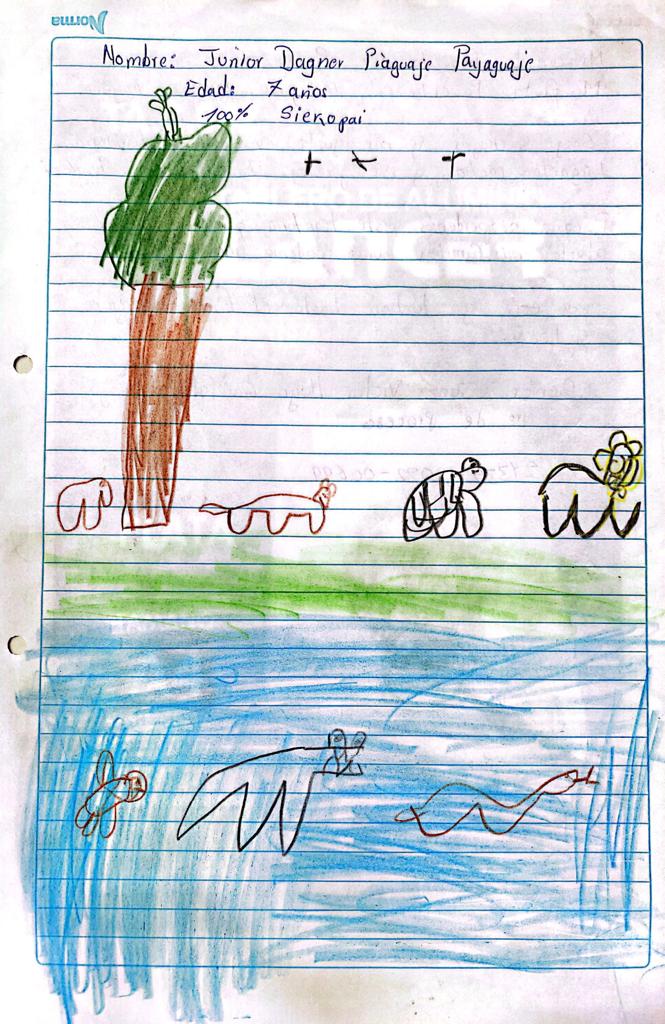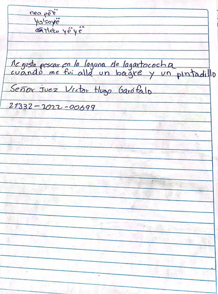 Desde pequeña he viajado a Lagartococha y me gusta mucho. Mi abuelo me contaba muchas historias y hechos muy importantes que yo no sabía, él siempre decía que allá es nuestro territorio, allí viven nuestros abuelos. Esas historias me inspiran mucho, quiero viajar y conocer más. Para los niños como yo, Lagartococha es el lugar en donde podemos aprender de historia, de hechos muy importantes y de la vida en la selva como un Siekopai. Lagartococha acoge muchas riqueza y cubre las necesidades de las mujeres Siekopai, mi mamá y mis abuelas siempre viajan en busca de arcilla especial para la elaboración de cerámicas tradicionales y allí se recolecta también la cáscara de un especie de árbol para la mezcla de arcilla que permite compactar las cerámicas que elaboran las mujeres siekopai.