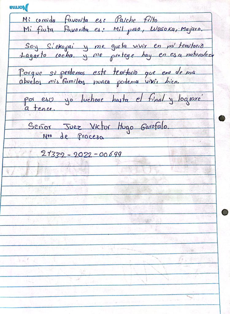 Esperamos que, por lo menos nosotros, lleguemos a tener Justicia después de tantos años de lucha. Ese territorio no es para quizás vender o negociar, ese territorio es la garantía de nuestros hijos, para que nuestra cultura no se pierda y siga existiendo en el país y en el mundo. No es que recién estamos yendo a conquistar o quitar a alguien, ¡no!, ese territorio es siempre Siekopai. Sin el territorio nuestra nuestra vida ya habría terminado, por eso queremos seguir transmitiendo a la nueva generación que está ahora amenazada, que ahora está bastante golpeada, pero nosotros como abuelos, como Siekopai queremos seguir manteniendo nuestra cultura, garantizando la existencia de nuevas generaciones. Esa garantía únicamente será posible con el retorno de nuestros jóvenes a ese territorio, si queremos seguir viviendo como Siekopai.